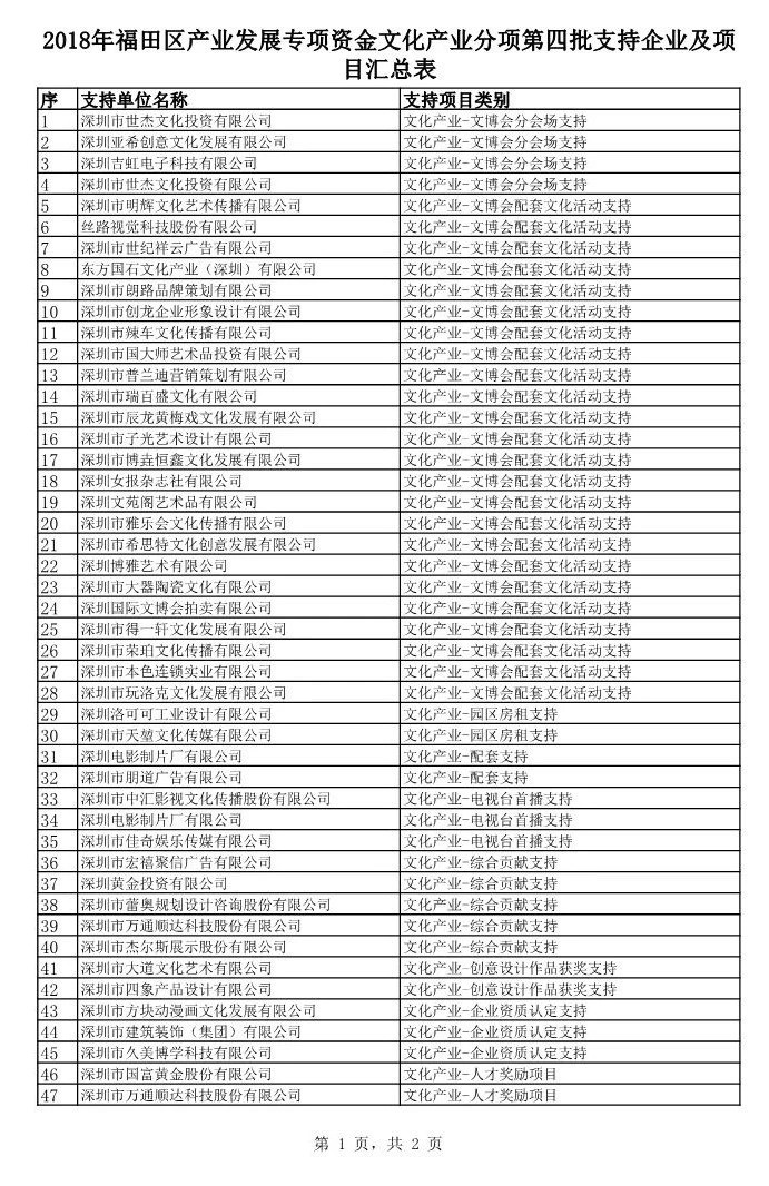 2018年福田區產業發展專項資金文化產業分項第四批支持企業及項目匯總表