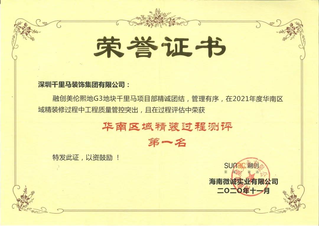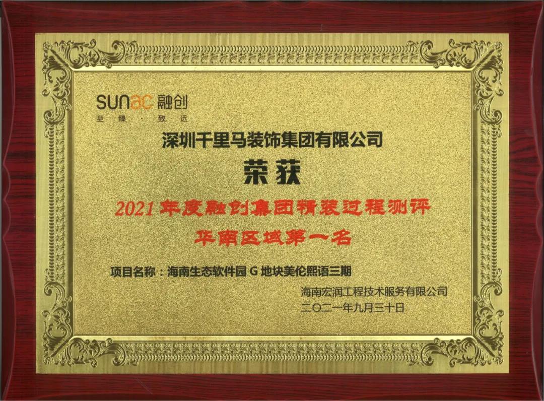 近日,千里馬裝飾位于海南省澄邁縣老城軟件園區的融創美倫熙語G3地塊15#、16#、20#樓項目憑借專業的施工、科學的管理,最終榮獲“2021年度融創集團精裝過程測評華南區域第一名”的優異成績。