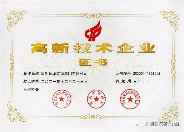 近日,深圳長(zhǎng)城裝飾集團(tuán)獲得深圳市科技創(chuàng)新委員會(huì)、深圳市財(cái)政委員會(huì)、深圳市國(guó)家稅務(wù)局及深圳市地方稅務(wù)局聯(lián)合頒發(fā)的“高新技術(shù)企業(yè)”認(rèn)定,認(rèn)定時(shí)間為2021年,有效期為3年。這是公司自2017年首次通過(guò) “高新技術(shù)企業(yè)”認(rèn)定以來(lái),第二次被認(rèn)定為“高新技術(shù)企業(yè)”。