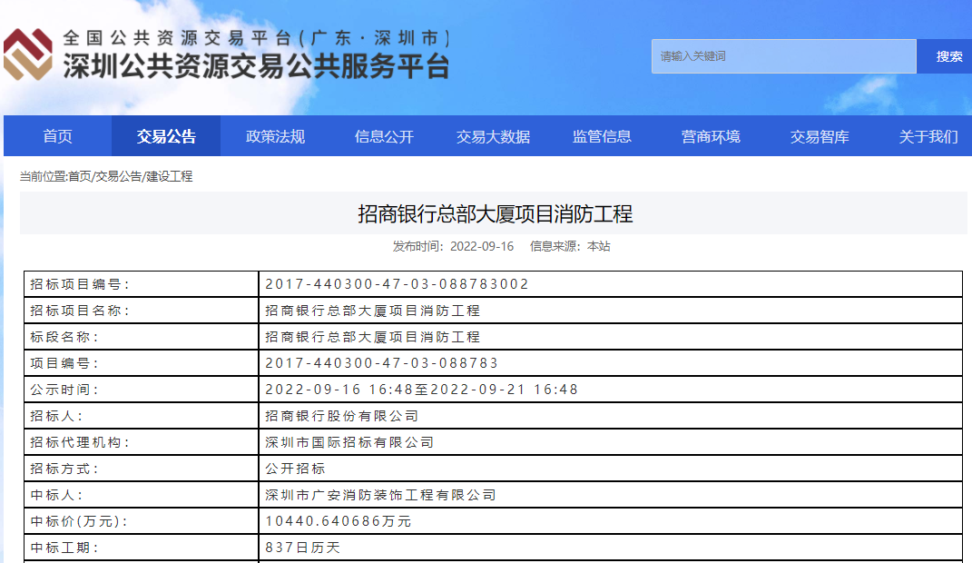該項(xiàng)目的消防專業(yè)分包工程采取公開招投標(biāo)的方式進(jìn)行,2022年9月21日,深圳市公共資源交易公共服務(wù)平臺(tái)通過(guò)公示流程,正式確立深圳市廣安消防裝飾工程有限公司中標(biāo)該項(xiàng)目消防工程!