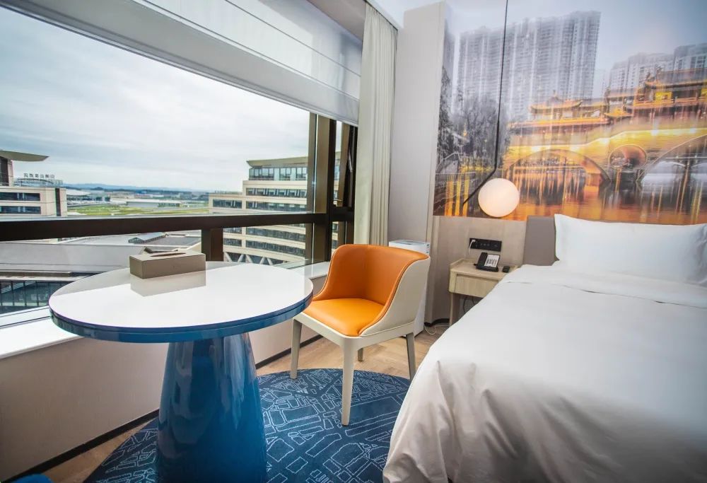 成都天府國際機場定位為國家級國際航空樞紐、絲綢之路經濟帶等級最高的航空港。航站樓外形的設計靈感來自金沙遺址出土的太陽神鳥金飾,從空中俯瞰,兩座航站樓猶如兩只神鳥振翅欲飛。機場配套酒店,由四川省機場集團有限公司自建自營,是全球首家與機場“同步規劃”、“同步設計”、“同步建設”、“同步投用”的酒店,地處天府國際機場最中央,與航站樓、GTC換乘中無縫連接,坐擁極致空港景觀,獨享“天府之眼”美譽。酒店以“神鳥馱日”為基本設計概念,與“太陽神鳥”航站樓交相呼應,將古蜀國文化的古樸意象和深邃內涵進行現代化完美演繹。