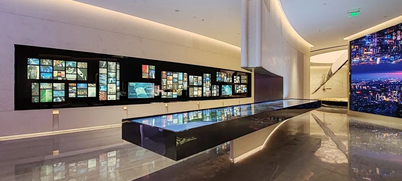 展廳內大量運用全息投影、弧形巨屏等高科技手段,呈現極具科技感的氛圍,提供了科技與藝術融合的沉浸式體驗,包括大氣震撼的懸吊式巨型LED沙盤、沉浸式影院的視覺體驗等。展廳外圍以烏托邦IP為主題街道藝術插件,將松弛感與藝術感融入每個角落,為參觀者帶來前所未有的輕松與自在感。