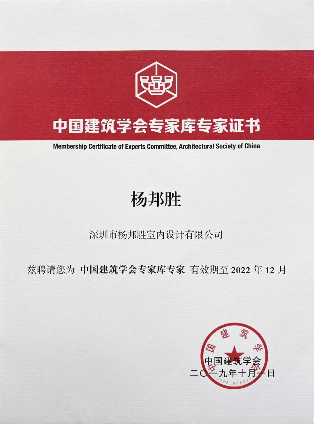 ▲  中國建筑學會專家庫專家證書