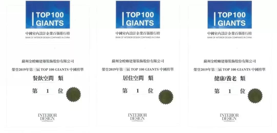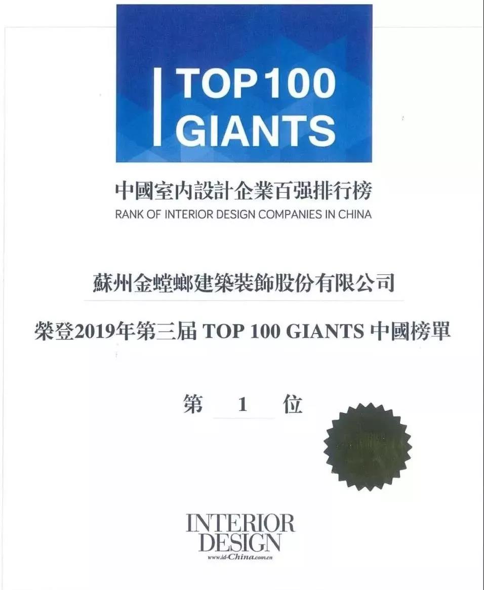 連續三年榮膺Top 100 Giants中國室內設計企業百強排行榜榜單,是金螳螂在設計專業技能與行業貢獻的最好見證,充分彰顯了金螳螂在行業的領先地位。金螳螂表示,未來,將繼續開拓更廣闊的市場,提供更優質及專業的設計服務,實現更加持續、健康的發展,努力為中國室內設計行業做出積極貢獻。