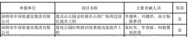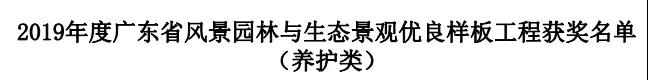 與“2017-2018年度廣東省優秀園林企業”一同公布的還有“2019 年度廣東省風景園林與生態景觀優良樣板工程”獎項。2019年6至11月,廣東省風景園林與生態景觀協會組織園林綠化專家,對廣東省風景園林與生態景觀協會會員單位申報的參評項目進行了查閱資料、現場考評、討論評議,最終評選出“2019 年度廣東省風景園林與生態景觀優良樣板工程”。中深裝選送的“蓮花山公園金桂路至山頂廣場周邊綠化提升工程”、“荔枝公園紅嶺路沿線景觀改造提升工程”榮獲“2019年度廣東省風景園林與生態景觀優良樣板工程獲獎名單(施工類) ”金獎;“西麗公園管理所公園綜合管養項目”榮獲“2019年度廣東省風景園林與生態景觀優良樣板工程獲獎名單 (養護類)”金獎。