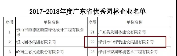 日前,廣東省風景園林與生態景觀協會公布了“2017-2018年度廣東省優秀園林企業”、“2019 年度廣東省風景園林與生態景觀優良樣板工程”最終評選結果。深圳市中深裝建設集團有限公司(以下稱“中深裝”)連續4屆入圍“廣東省優秀園林企業”名單,三個園林綠化項目榮獲“2019 年度廣東省風景園林與生態景觀優良樣板工程”金獎,園林綠化專業水平再獲權威肯定。