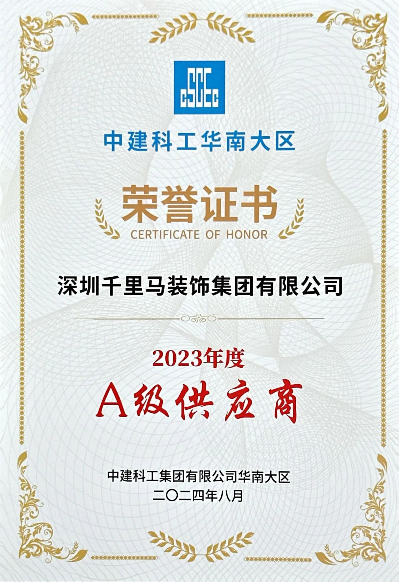千里馬喜報 | 榮獲中建科工2023年度A級供應商獎
