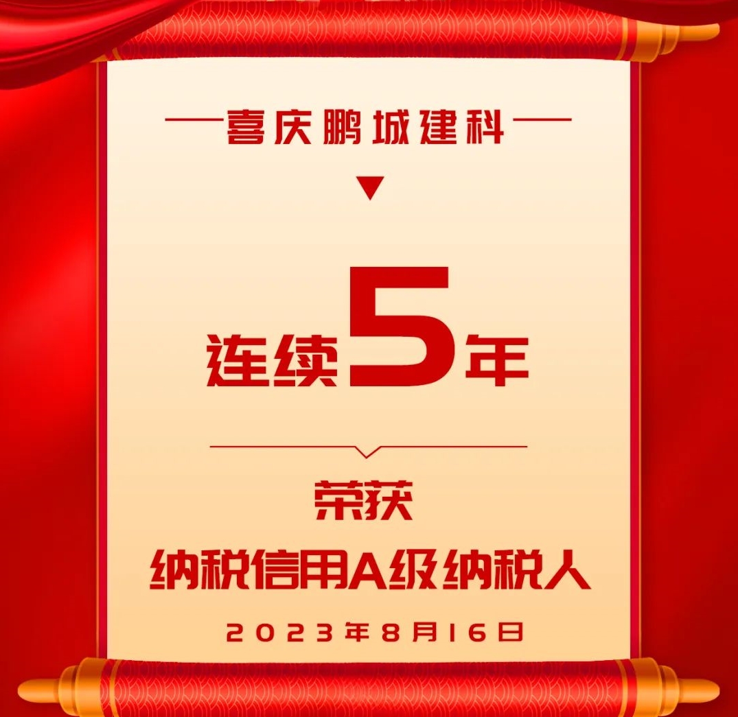 近日,深圳鵬城建科集團有限公司被國家稅務總局福田稅務局評定為2022年度納稅信用等級A級納稅人。自2018年以來,公司已連續五年被評為A級納稅人。