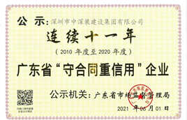 近日,深圳市中深裝建設集團有限公司(以下稱“中深裝”)榮獲“2020年度廣東省守合同重信用企業”榮譽稱號,這是其連續11年獲此殊榮。 ?