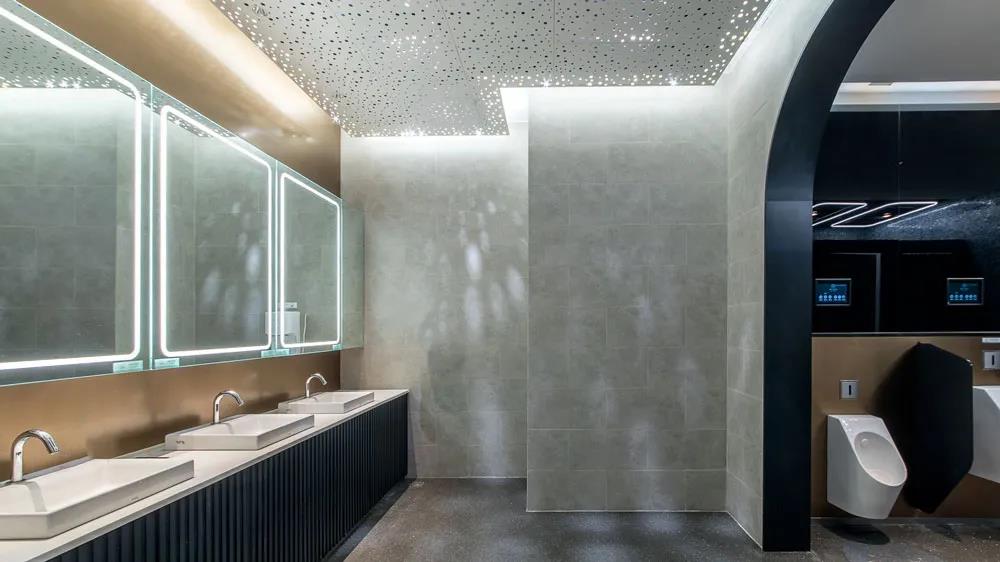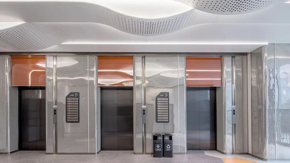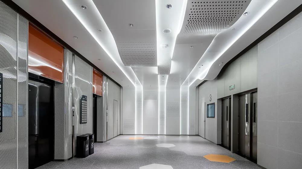 在次要空間中,衛(wèi)生間和電梯廳都延續(xù)了生長的概念,通過現(xiàn)代時尚的弧形邊角處理,形成一種微妙的科技感,局部點綴的色彩,使空間增加了年輕的氛圍。