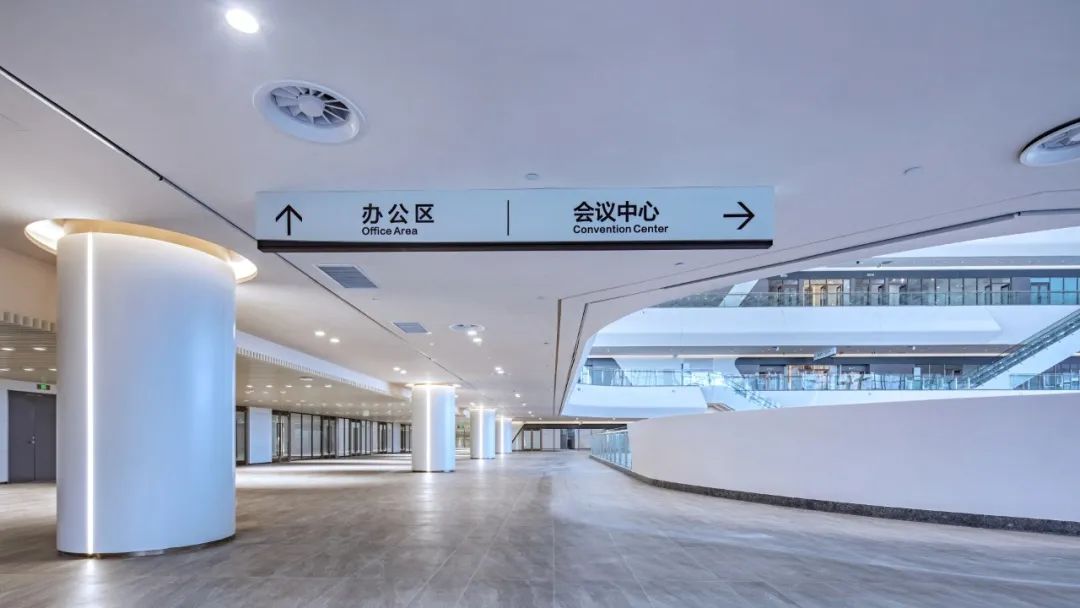 走進門廳,一股簡潔明快、清新大方的現代之風撲面而來。站在高大寬闊的大廳前,人顯得如此渺小。放眼望去,無論是那充滿海浪流動感的四層樓裙,還是那連綿起伏、波瀾涌動的波浪形吊頂,亦或是那鑲嵌在波浪之中宛如明珠般的點點燈光,都讓人有一種身臨浩瀚大海之感。主登錄廳也是整個會展中心最具特色、最核心、最重要的區域之一。