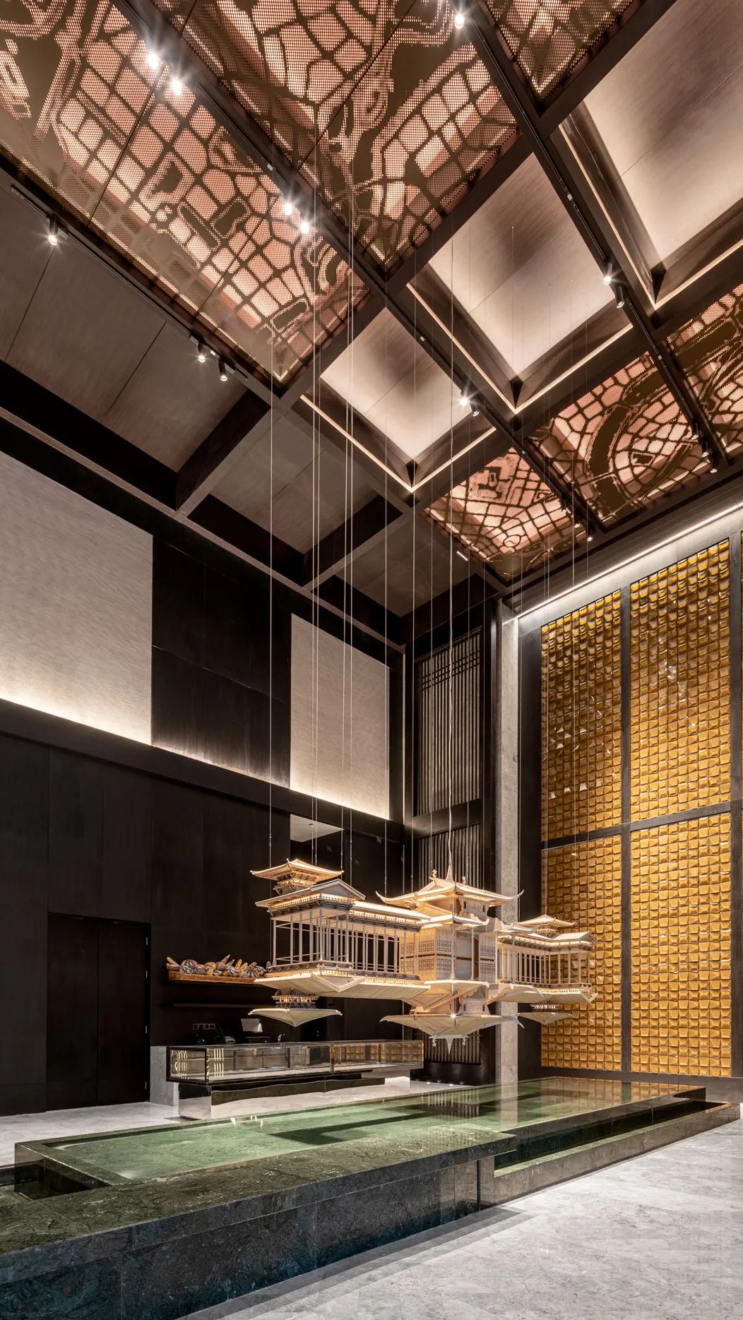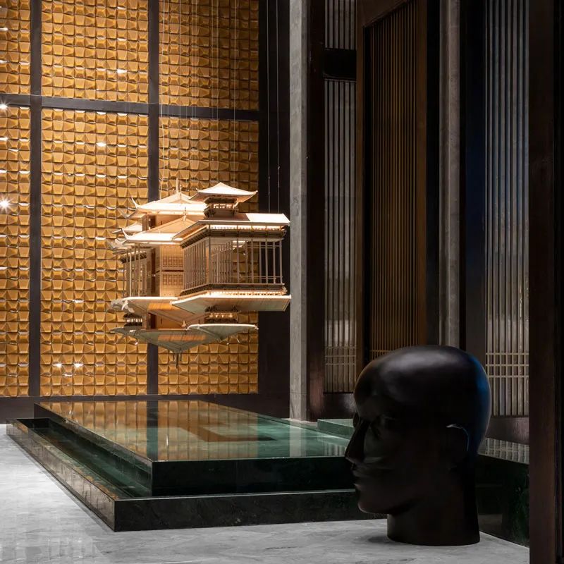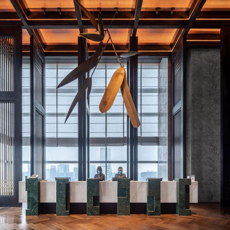酒店采用獨特的雙大堂設計,首層大堂以“胡同”為主題,連接著世外桃源和別有洞天的謐境,穿過高高的木扇門,9m的高空星羅棋布的星光繪制成蓉城的地圖,天地交融韻味獨特,貼心的地暖設計讓溫度和濕度都仿佛置身桃花園中溫暖的家。