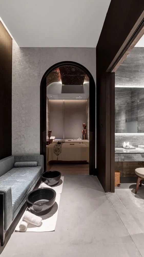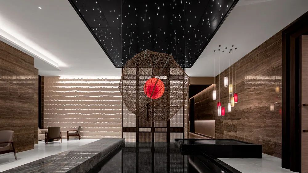 位于18層的養生中心以“庭院下溫暖的夜光”為靈感,在600㎡的空間中將山之自然,水之靜謐化作空間意境,300㎡的云端無邊際恒溫泳池讓賓客仿佛置身于“雨下的庭院”。