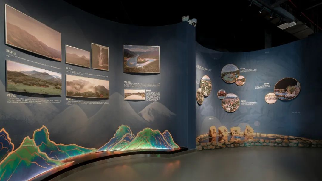 本展區展示恩平得天獨厚的自然資源,與其孕育出的厚重文明。山明水秀單元,以藝術畫的手法展示恩平的山水,結合圖文展板,詳細介紹君子山、大人山等內容。場景復原恩平溫泉,墻面采用水珠背景,展示溫泉具有豐富礦物質元素和微量元素,圓形展板展示熱水溫泉、黑泥溫泉等詳細內容。史前遺存單元,復原恩平史前生活場景,結合圖文展板,出土文物等資料,展示三官山遺址、白虎頭嶺遺址等內容,展示史前恩平人的生活場景。為了讓觀眾更直觀了解各時期的恩平歷史,展區按照秦朝至民國時期13個歷史時期,在LED大屏幕上設置13個屏幕觸點,觀眾只要點擊相應的觸點,就會彈出文字內容,既創新了展示方式,又增加了觀展樂趣。