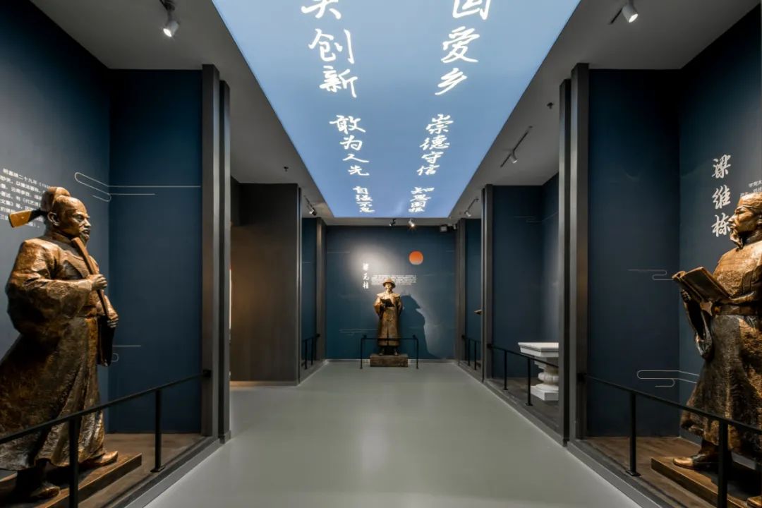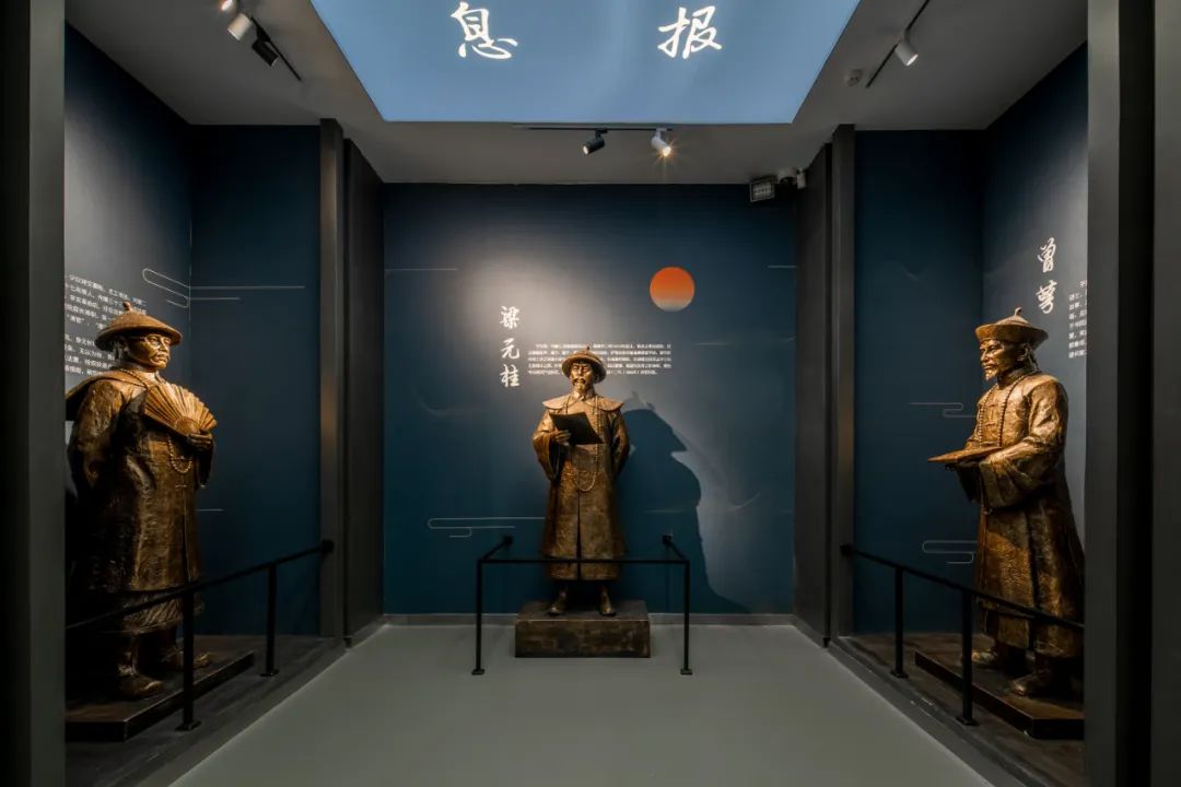 該展區主要陳列展示恩平教育發展歷史成果以及古代的官吏名人。步入文教興盛單元,歷史遺存的匾額赫然入目,兩根筆筒形狀的立柱鐫刻歇馬村祖訓,兩側圖文展板結合書院牌匾和歷史文物,展示古代恩平的著名書院,以及對文教興盛和文化傳承的高度重視。弧形中心設置歇馬村標志性旗桿,上方設計多媒體顯示屏,循環播放歇馬村八大旗桿內容,頂端設計玉斗,寓意才高八斗。旗桿后方懸掛孔子畫像,背景設計為弧形書架,寓意歇馬村崇文重教的風尚。書架上方的弧形墻面,設計古代科舉過程,采用環形畫的方式,再現古代學子登科的過程,使參觀者了解古代考取功名的艱辛歷程。歷史先賢部分,以獨立空間展示恩平先賢,中間設計梁元桂雕像,兩側采用圖文、人物造型等手段,展示其生平介紹等內容,頂部采用歇馬村勵學制為原型進行藝術設計,再現先賢生平,與整個展區相互呼應。