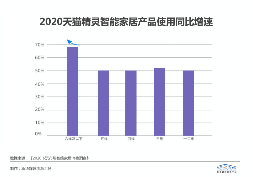 根據《2020下沉市場智能家居消費洞察》顯示,50%以上的天貓精靈智能家居使用者在三到六線城市,其中六線城市用戶增速最快,四線城市銷量、銷售額增長最快,下沉市場正在成為智能家居行業的新藍海。同時,根據天貓平臺數據顯示,智能開關、智能落地燈、智能電蒸箱等價格在50元到300元之間的小家電,在下沉市場年銷量同比增速均超過300%,也側面佐證著這一現象。