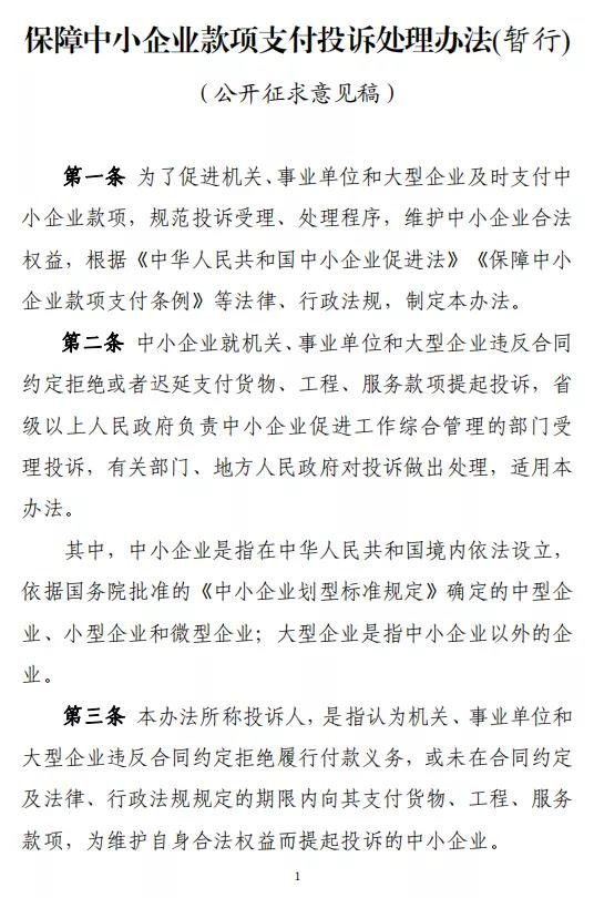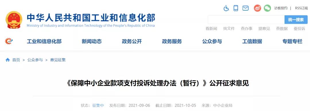 為進(jìn)一步貫徹落實《中小企業(yè)促進(jìn)法》和《保障中小企業(yè)款項支付條例》要求,切實保障中小企業(yè)合法權(quán)益,工業(yè)和信息化部中小企業(yè)局組織起草《保障中小企業(yè)款項支付投訴處理辦法(暫行)》(征求意見稿),公開征求社會各界意見,意見征求截止日期為2021年10月5日。