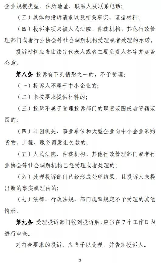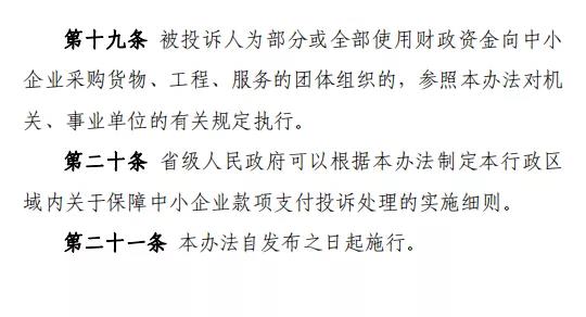 中小企業(yè)就機關(guān)、事業(yè)單位和大型企業(yè)違反合同約定拒絕或者遲延支付貨物、工程、服務(wù)款項提起投訴,省級以上人民政府負(fù)責(zé)中小企業(yè)促進(jìn)工作綜合管理的部門受理投訴,有關(guān)部門、地方人民政府對投訴做出處理,適用本辦法。