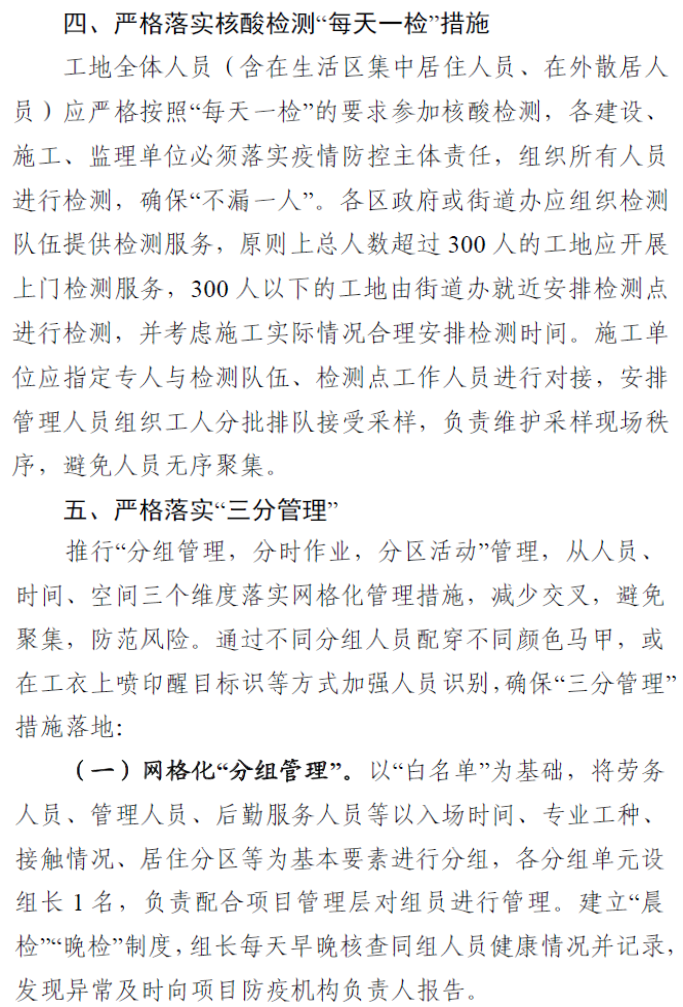 3.新進場工人必須在獨立設置的觀察居住區居住四天,核酸檢測“四天四檢”均無異常后方可進入其他區域居住,期間不得與原有工地人員混居。