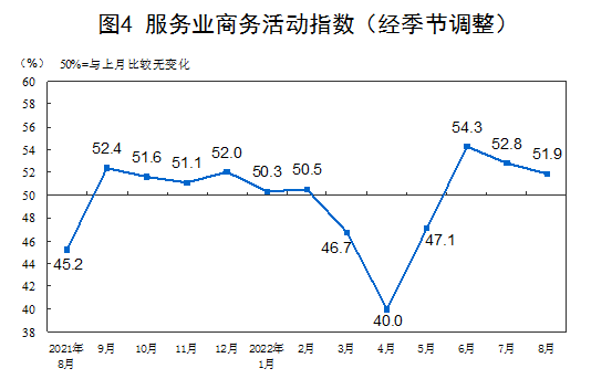 8月份,非制造業商務活動指數為52.6%,比上月下降1.2個百分點,仍位于擴張區間,非制造業連續三個月恢復性增長。