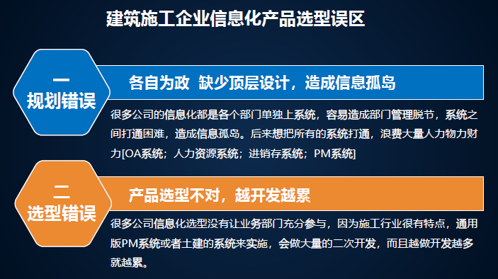 建筑施工企業信息化產品選型誤區。很多企業信息化又想做又害怕,我們總結了幾方面的問題,規劃錯誤,缺少頂層設計造成信息孤島。每一個部門買自己的。我們了解過一個企業有八套系統,都是獨立的,最后作為領導什么數據看的都是不一樣的。產品先型不對,越開發越累,要懂行的才能研究出來,如果找一個軟件,他什么都不懂,能給你研發出相關行業軟件嗎?不行,要選對。萬能論、無用論,軟件不是萬能的,也不是無用的,關鍵是怎么用。能實施好才是最主要的。對于信息化,不管花幾十萬、幾百萬、幾千萬,要落地,否則就打水漂了。信息化是請老師還是請學生?