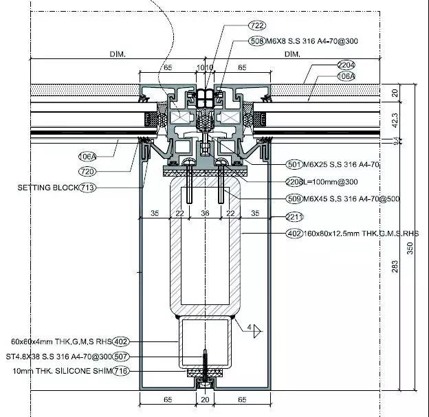 該設計采用四個掛點,確保其結構穩定可行,上橫梁與普通橫滑式單元幕墻一致,下橫梁設計兩道完整的密封線,如圖3所示。