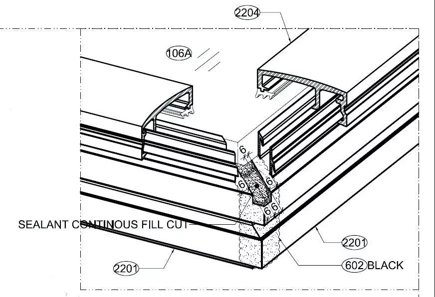 針對層間單元體標準位下節點,其設計特點是:可視板塊的安裝在不需要安裝L碼的位置切除一段略大于L碼件的缺口,即圖中藍色標注部位;L碼塞入并滑移到所需要的位置(兩端+中間),兩端L碼起結構支撐,中間L碼為了防止密封片翹曲;卡入帶膠條的通長密封片,密封片之間打密封膠,形成連續的密封帶。如圖5所示。