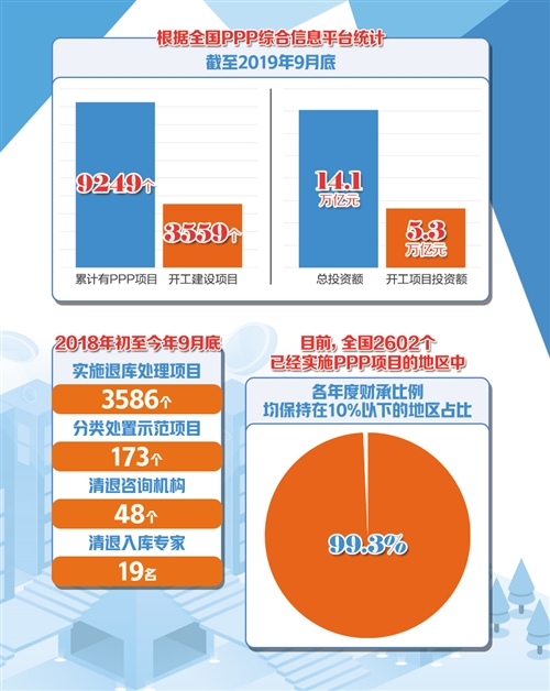 2018年初至今年9月底,財政部共對3586個項目實施退庫處理,分類處置173個示范項目,清退48個咨詢機構和19名入庫專家。目前,在全國2602個已經實施PPP項目的地區中,99.3%的地區各年度財承比例均保持在10%以下。